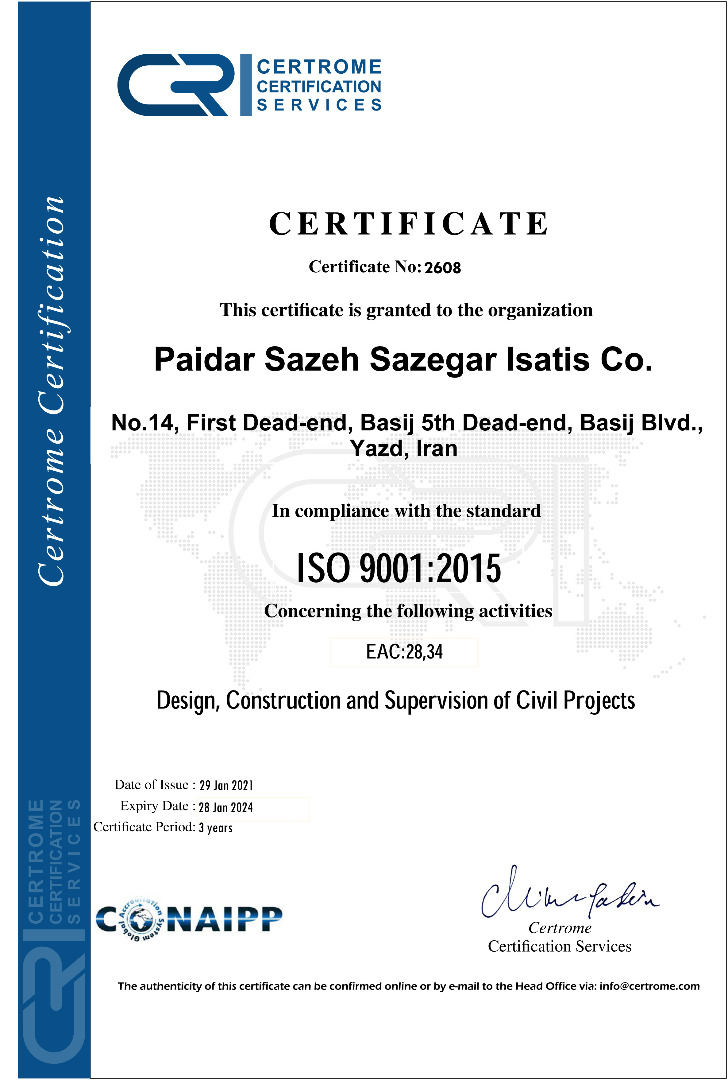 کسب گواهی استاندارد ایزو ۹۰۰۱(استاندارد مدیریت کیفیت خدمات و تولیدات) به دست مهندسان و متخصصان با تلاش و دانشمند شرکت پایدار سازه سازگار ایساتیس