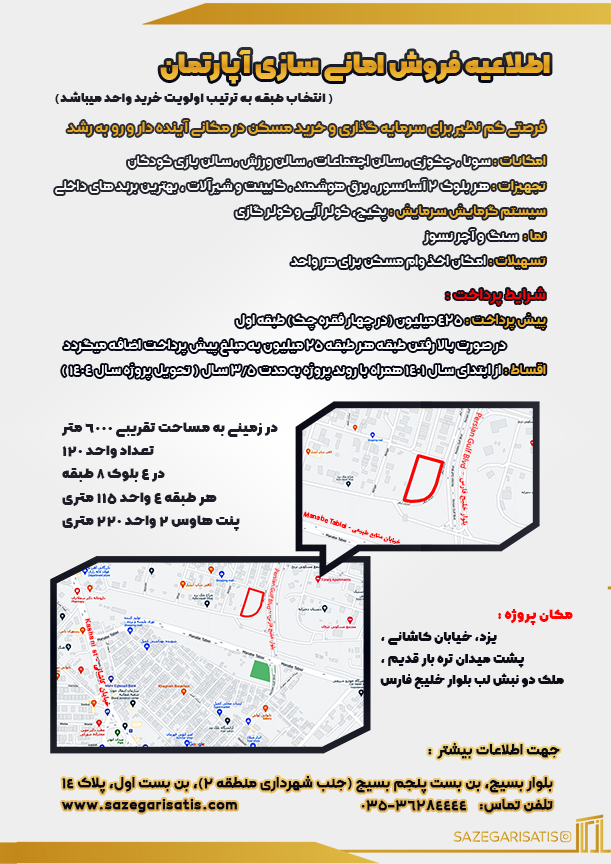 اقساط : از ابتدای سال ۱۴۰۱ همراه با روند پروژه به مدت ۳/۵ سال ( تحویل پروژه سال ۱۴۰۴ )